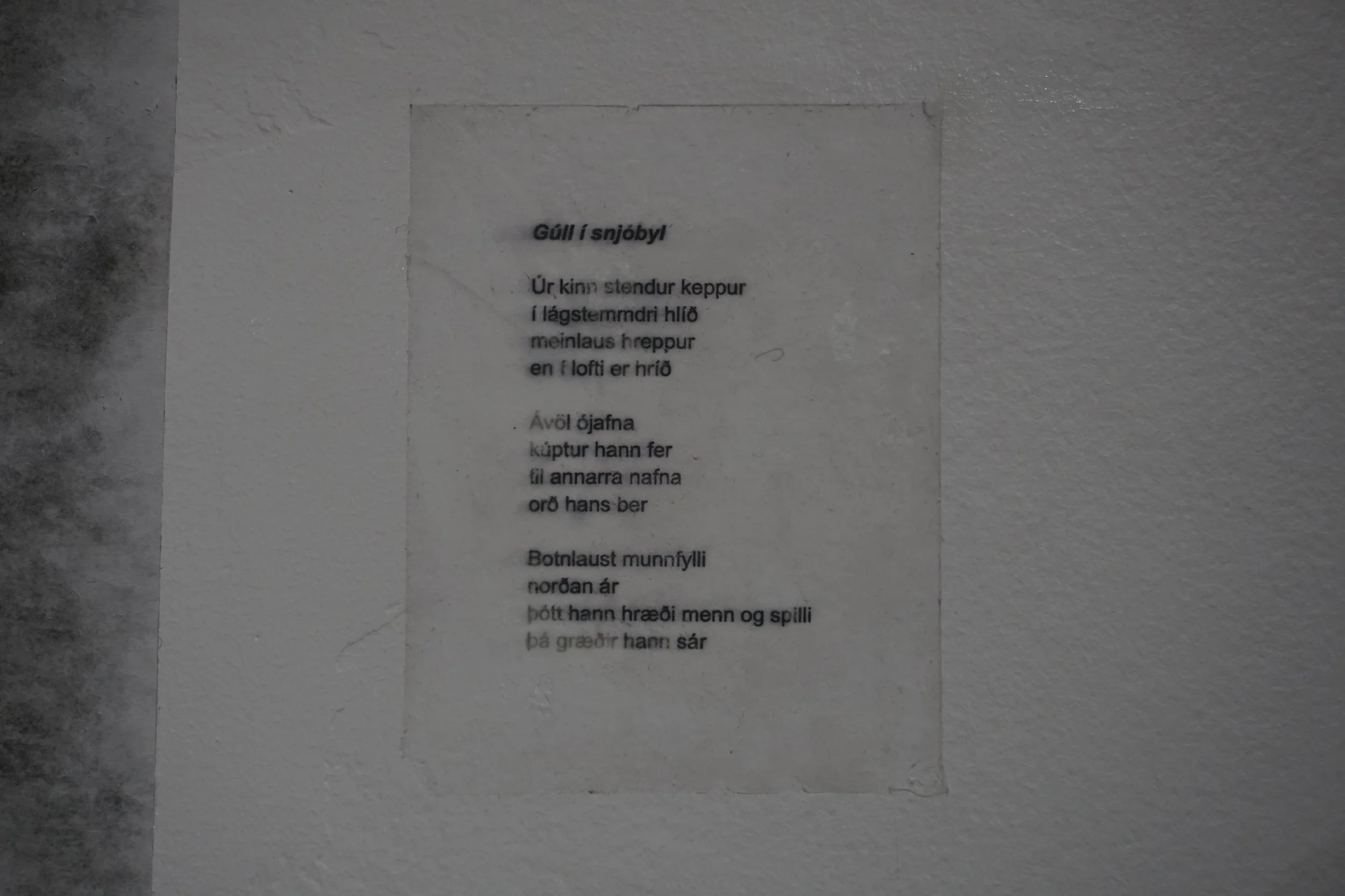 Gúll í snjóbyl (2024)Límþrykkt kolateikning á vegg, ljóð. Gúll er staðsettur á milli-stafa á Seyðisfjarðarvegi