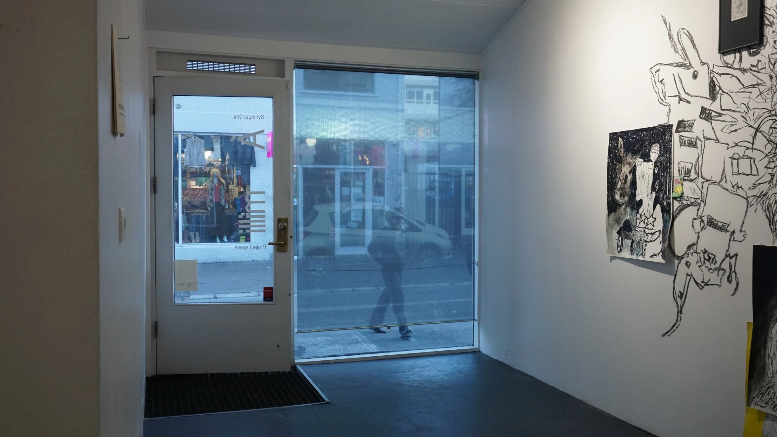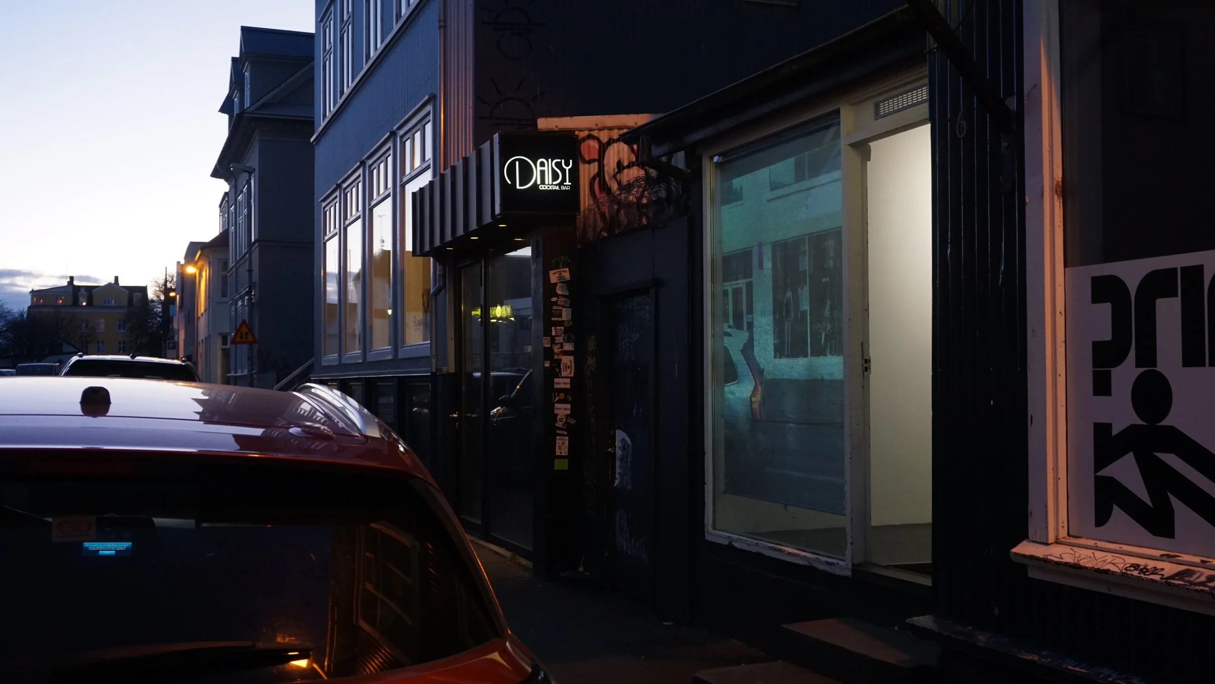 The following text is from my recent work in Margaretenstrasse 110, Vienna, Alles außerhalb der Einhundertzehn (2025), this work on Ingólfsstræti is created with the same principal: Filmed from within the space, you see a documentation of the street’s activity through a particular frame of time. A conversation is created with the events outside, the perspective of the filming and finally the installation itself.