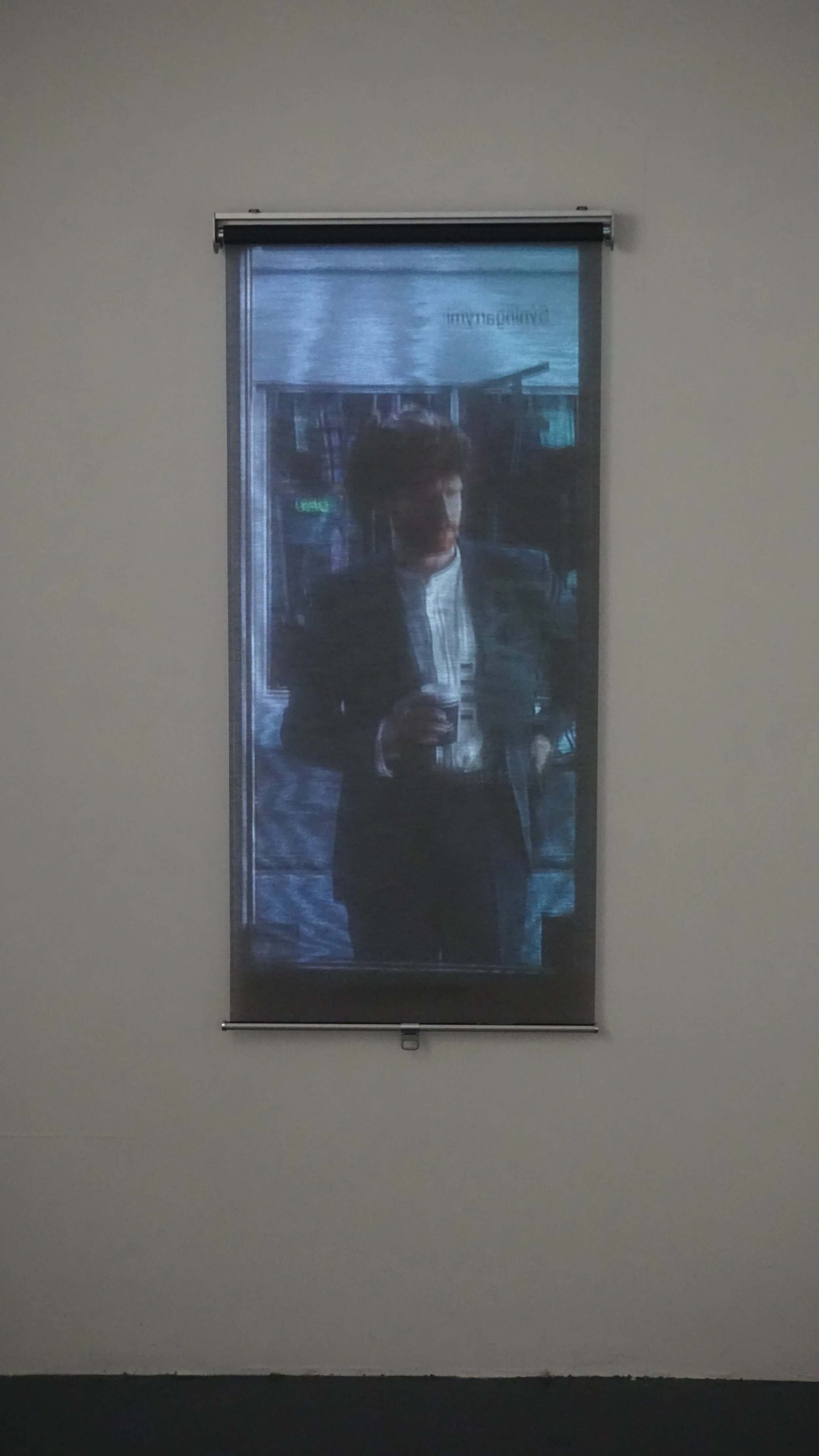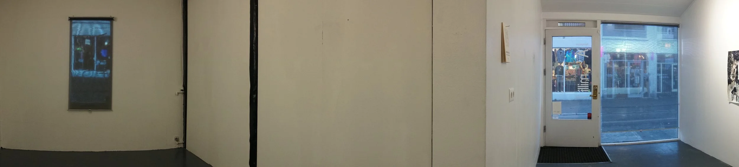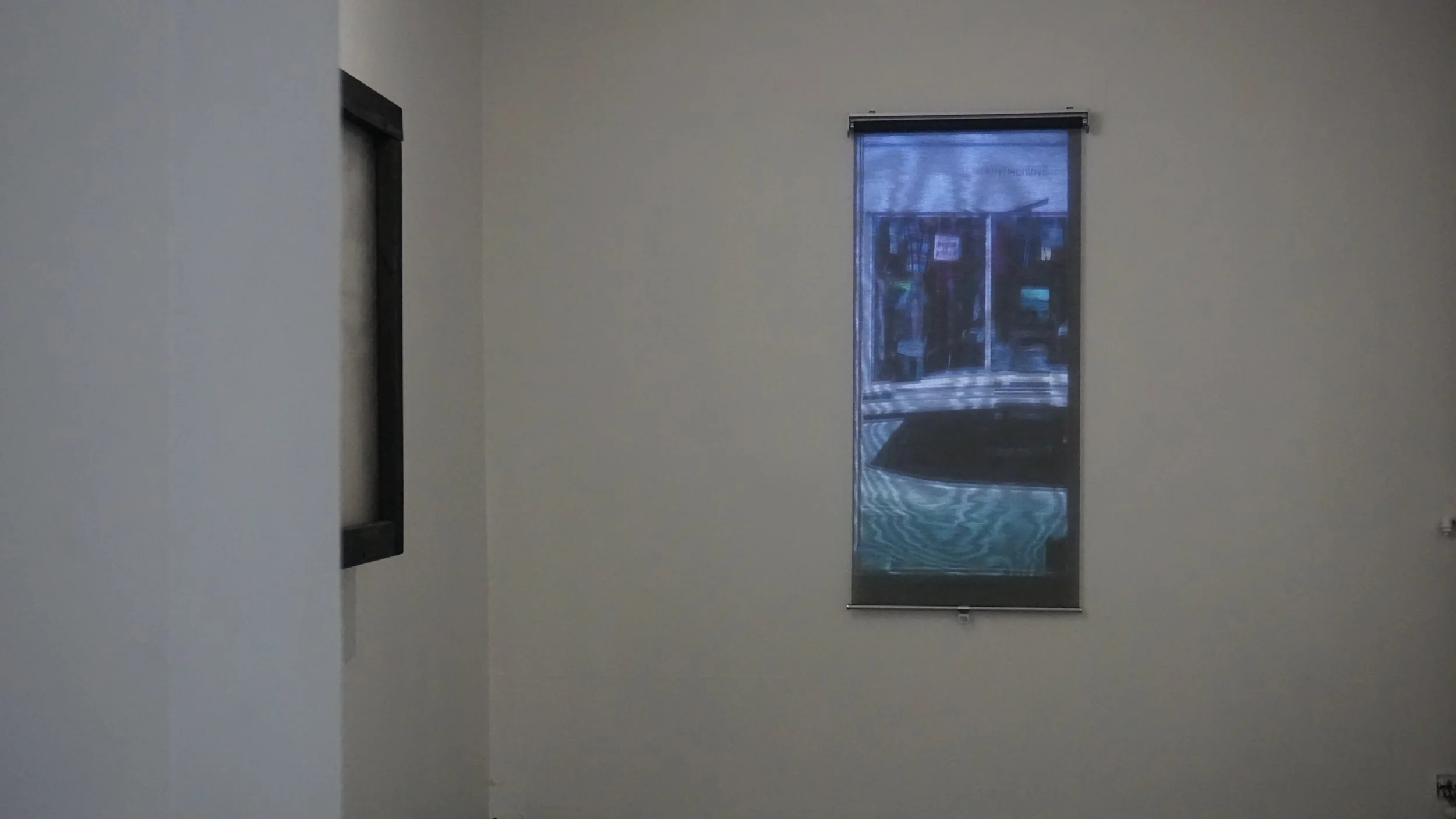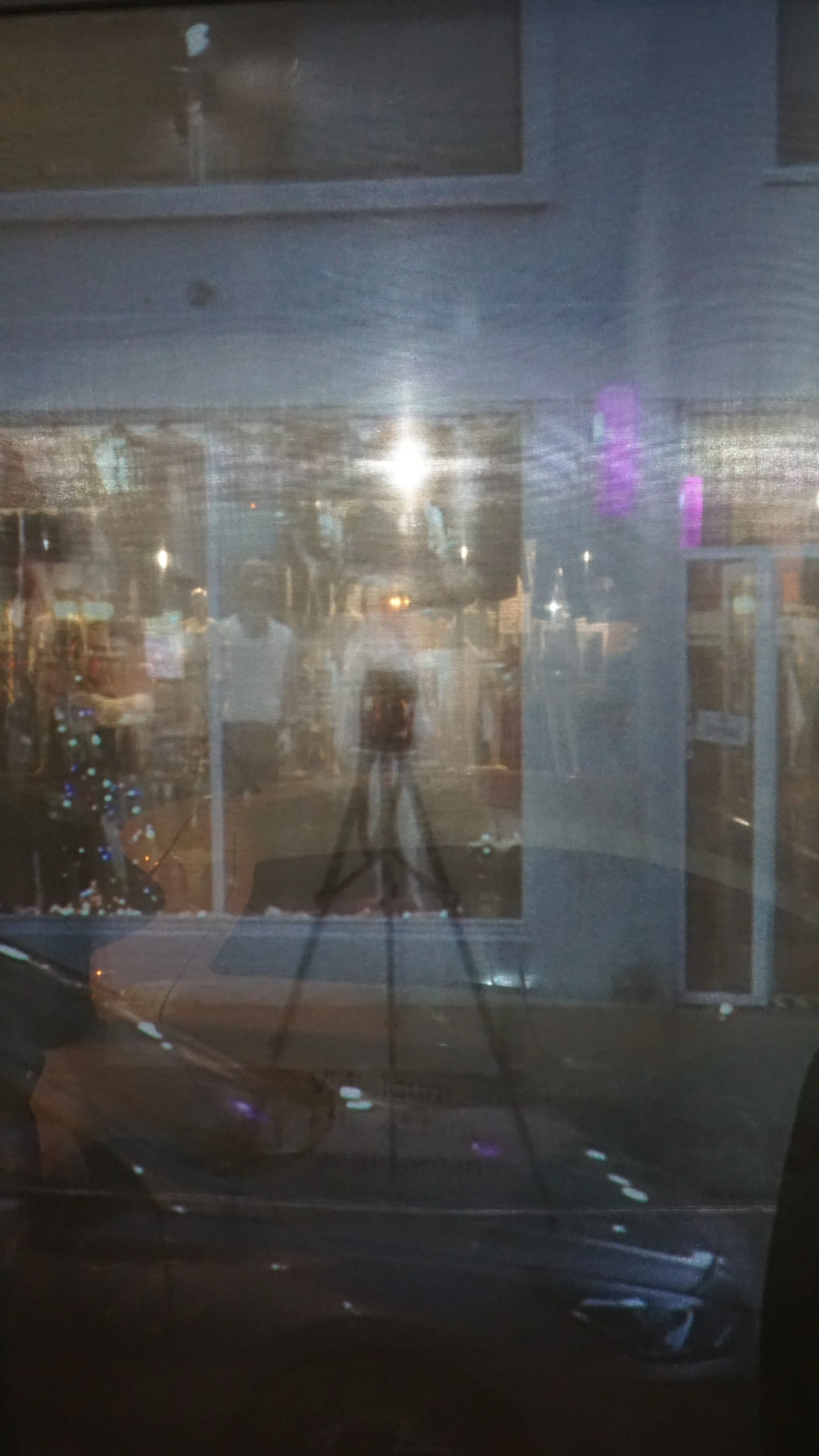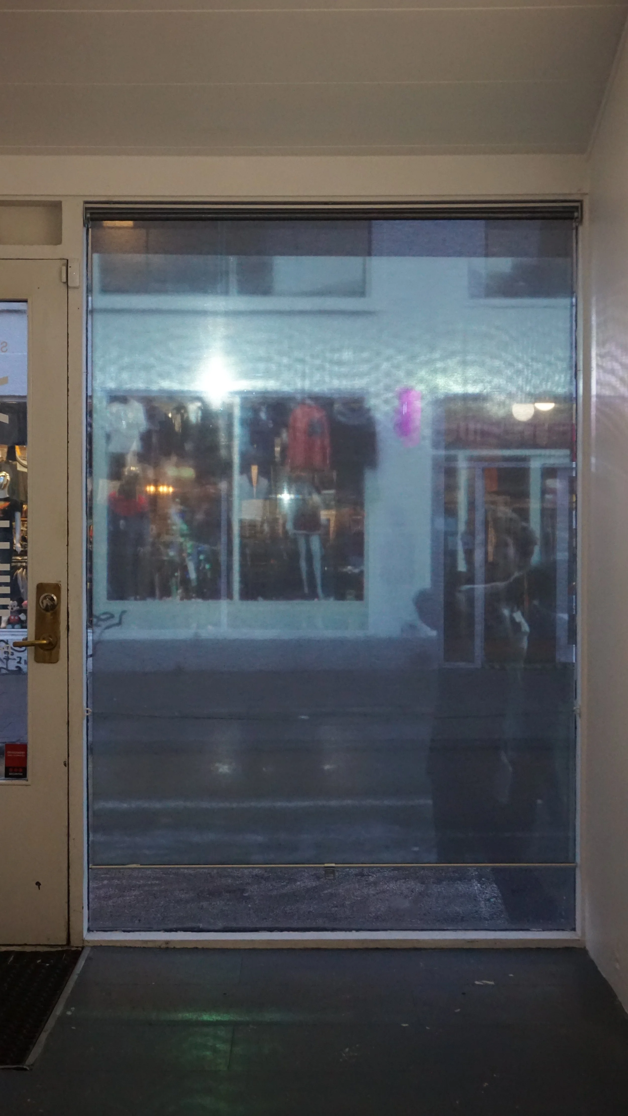 I’ve installed grey, semi-transparent, curtains on the window in front and the wall in the back. the projections are pointed at them. Creating a double layer on the inner wall and large window.